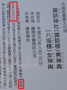 2025/08/23 藤岡市よ、恥ずかしいぞ! 藤岡諏訪神社の宮神輿は三井越後屋からの奉納で、藤岡市の重文に指定されている。その解説板に安政9年(1780)とあるが、これは間違い。「安永9年」が正しい。恐らく解説文作成時のタイプミスと推察されるが、誰も気づかないのかね。これが藤岡市の文化度かな(言い過ぎ?)。 tagPlaceholderカテゴリ: